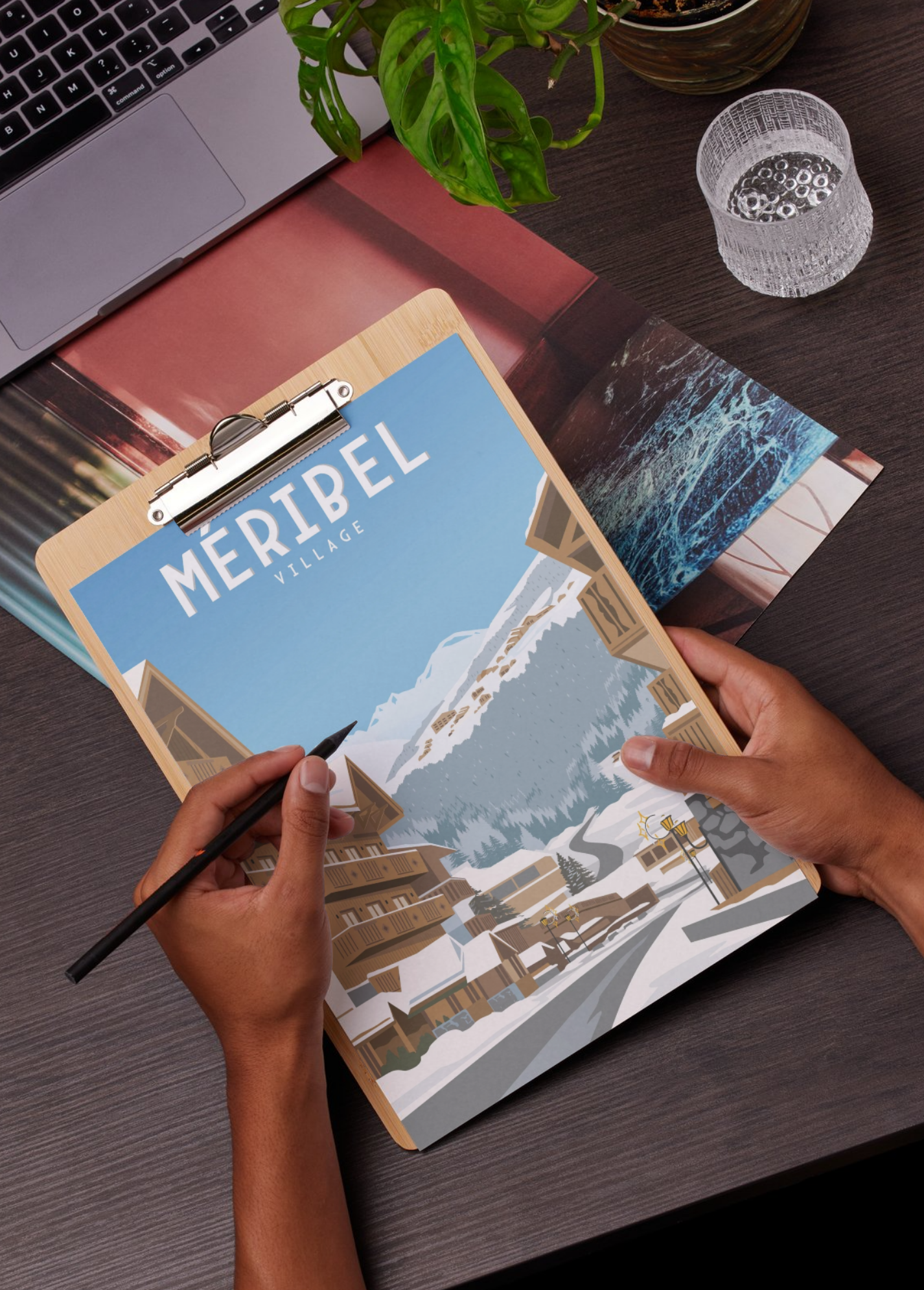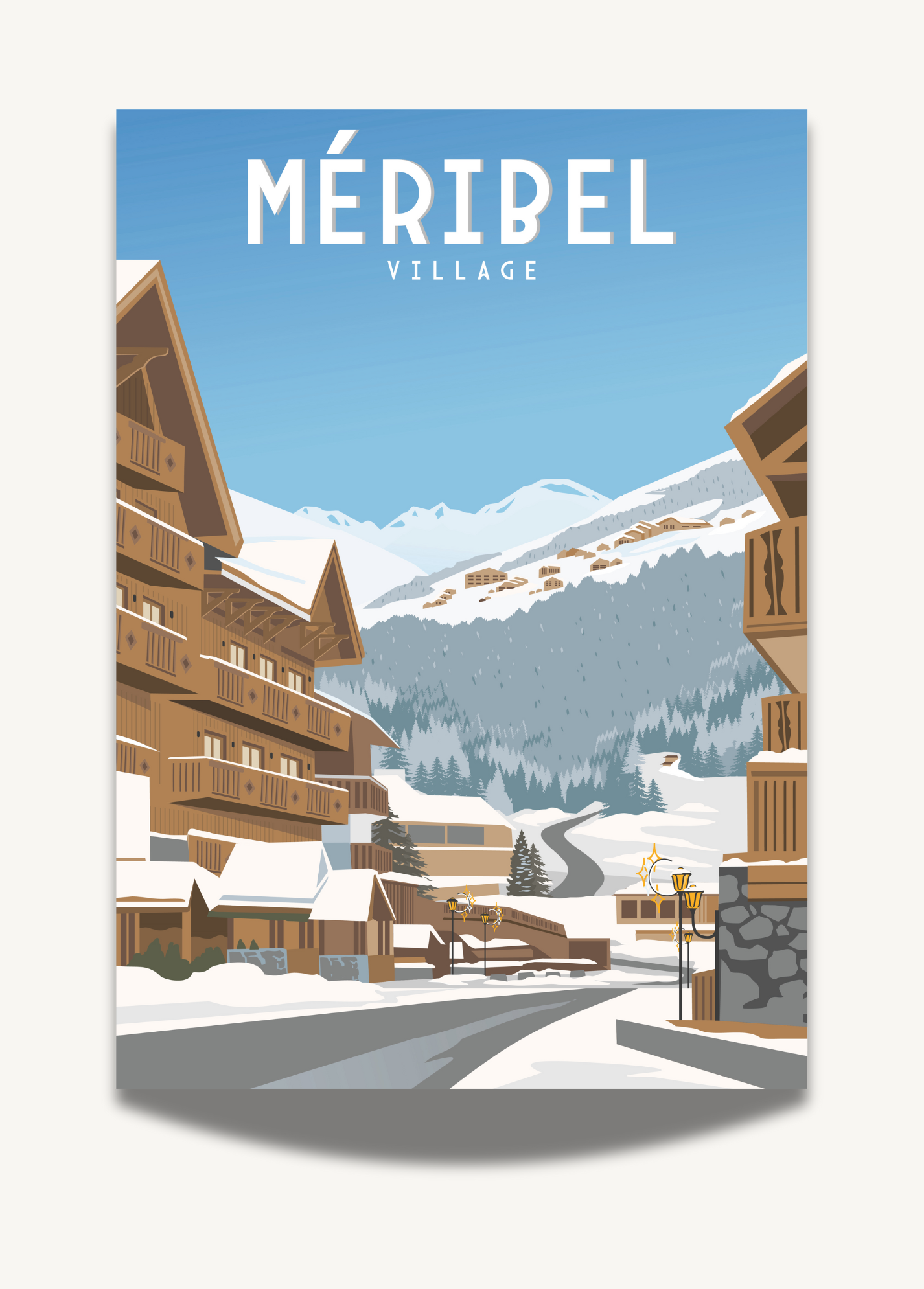 Notre illustration du village de Méribel met en valeur ses façades en bois emblématiques, parfaitement intégrées au paysage montagnard. Les chalets aux lignes chaleureuses et authentiques reflètent l’architecture traditionnelle de la station, tandis que la montagne environnante encadre le village avec douceur. L’ensemble dégage une atmosphère conviviale et harmonieuse, symbole de l’identité de Méribel, entre respect du patrimoine alpin et art de vivre en altitude.