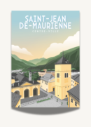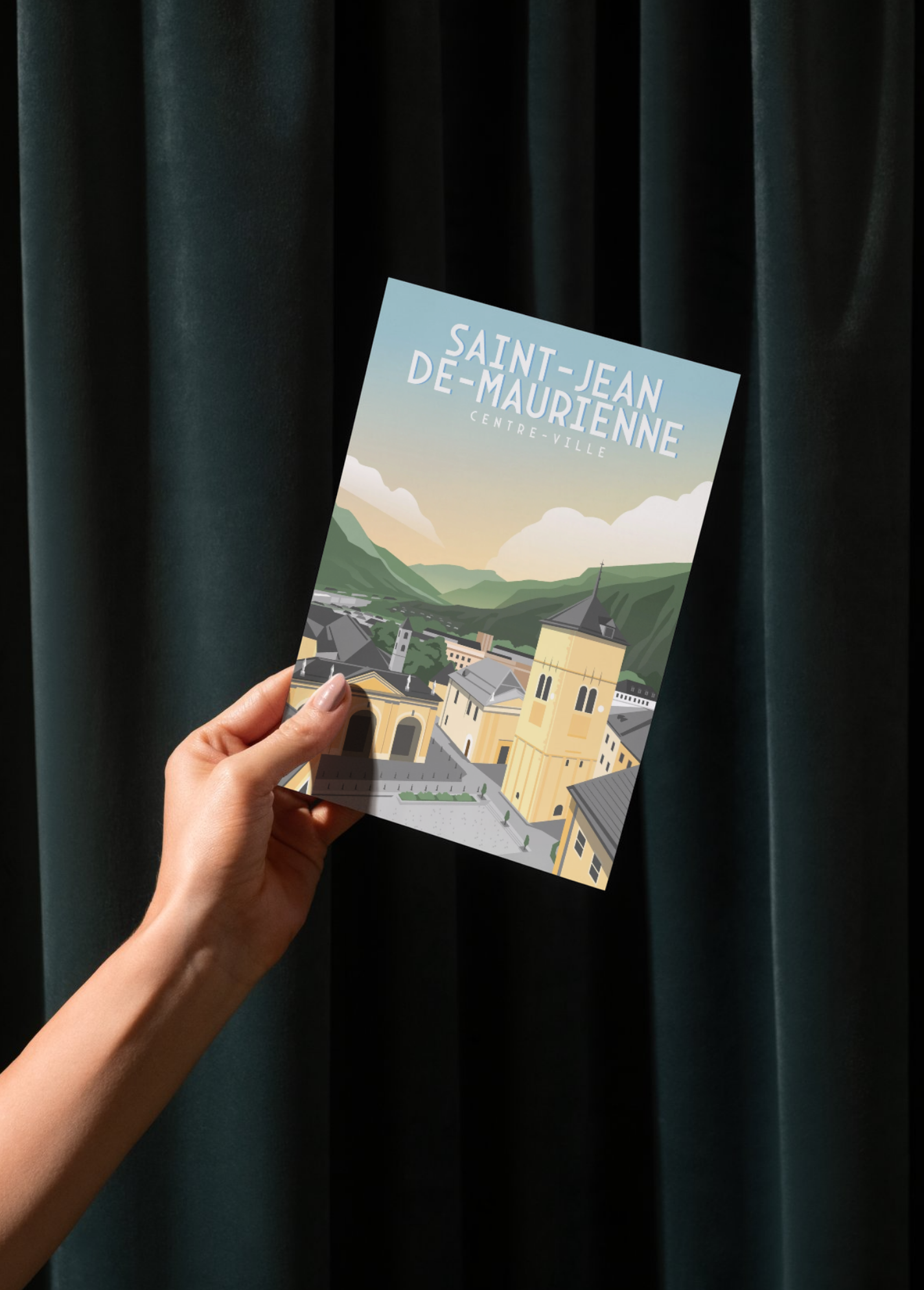 Au cœur de Saint-Jean-de-Maurienne, notre illustration met en lumière le centre-ville et son atmosphère chaleureuse. L’église se dresse au milieu des bâtiments aux façades jaunes, baignés par une lumière douce qui rappelle le caractère ensoleillé de la vallée de la Maurienne.