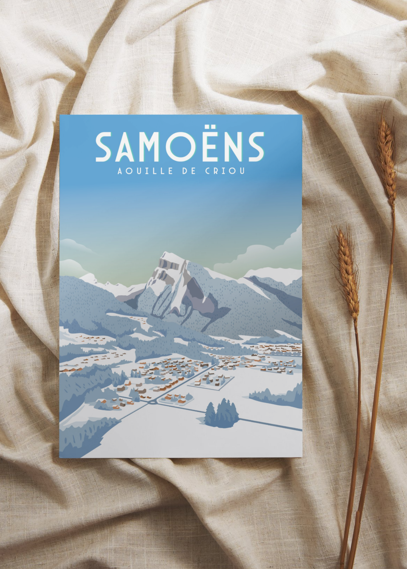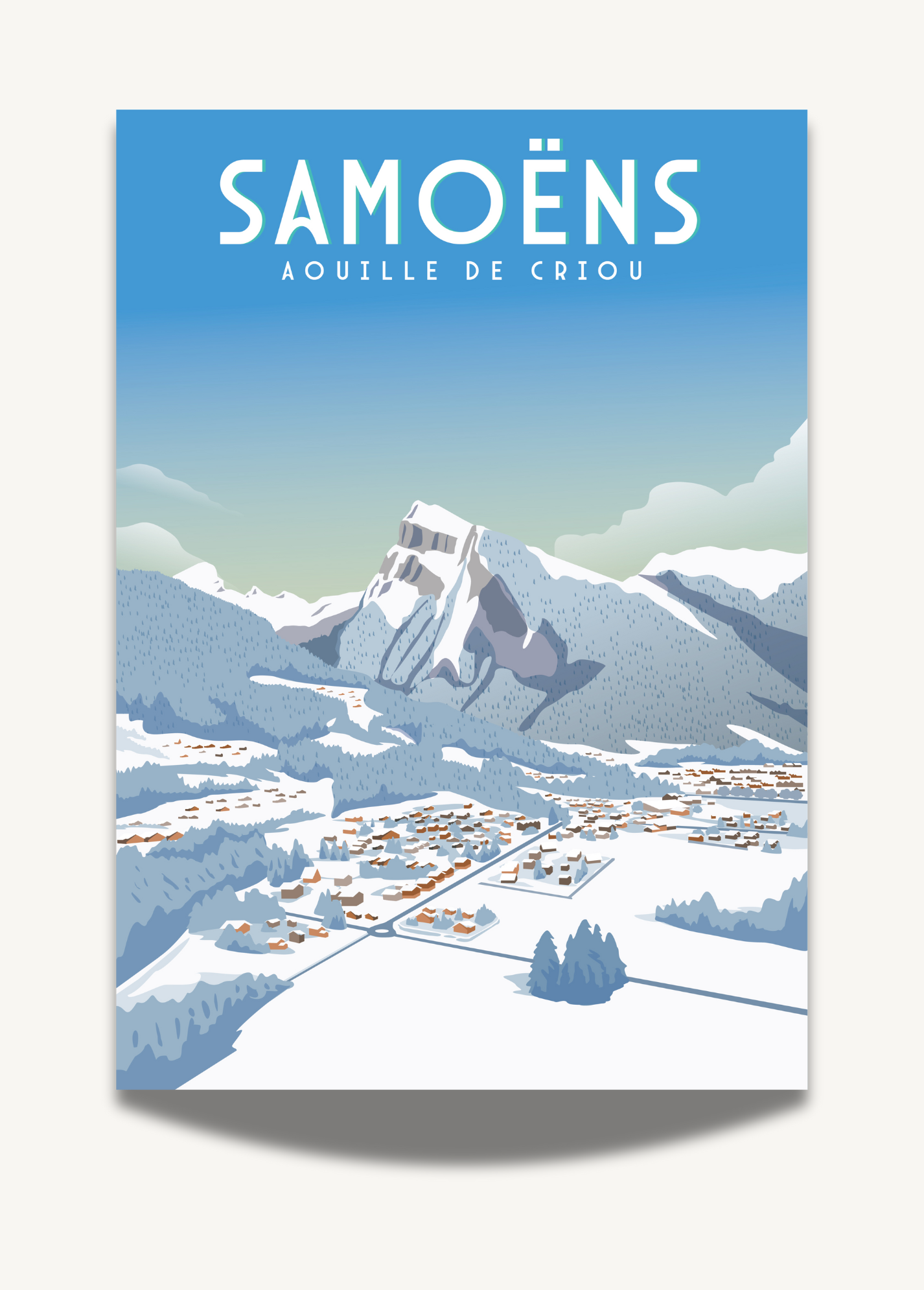 Depuis les hauteurs, Samoëns se dévoile dans notre illustration comme un village niché au creux de la vallée. Les toits s’organisent harmonieusement, tandis qu’en arrière-plan les sommets de l’Aouille de Criou dominent le paysage et rappellent la force de la nature alpine. Cette vue en hauteur capture l’équilibre parfait entre vie de village et grandeur des reliefs, offrant une atmosphère paisible et authentique, typique de Samoëns.
